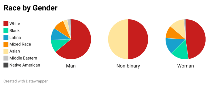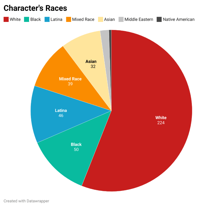 By gender, women were far more diverse than the men with 64% of male characters being white and 48% of female characters being white.