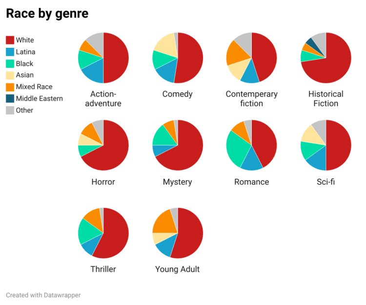 By genre, romance and contemporary fiction were the most diverse with 42.5% and 45% of the characters being white, respectively. The least diverse genres was historical fiction with 72.5% of the characters being white, with horror and mystery coming in joint second last at 67.5%.