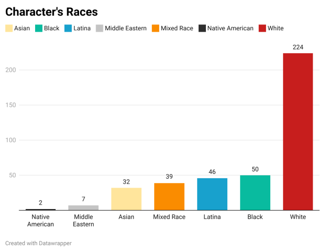 The diversity within the characters of colour was also greatly limited. 87% of all the mixed-race characters were half white and overall, it only came up with 7 South Asian characters, every single one of which had the last name Patel.